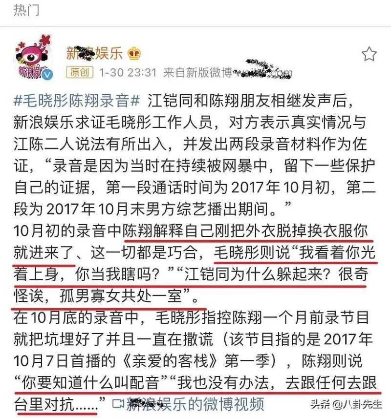 没想到毛晓彤马上反击,先是工作人员指责陈翔“谎话连篇,断章取义”,接着毛晓彤放出了通话录音,录音中陈翔对自己跟江铠同共处一室、脱衣服、江铠同心虚躲藏的细节百般狡辩。