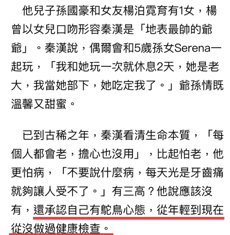 最后被问到身体情况,秦汉表示自己也担心会老,但是担心没用,比起怕老他更害怕生病,不要说什么病,每天光牙疼就够让人受不了,他表示自己的身体还蛮好,应该没有三高,还承认自己有鸵鸟心态, 性格上比较懦弱,不敢面对现实,所以从年轻到现在一直没有做过体检。