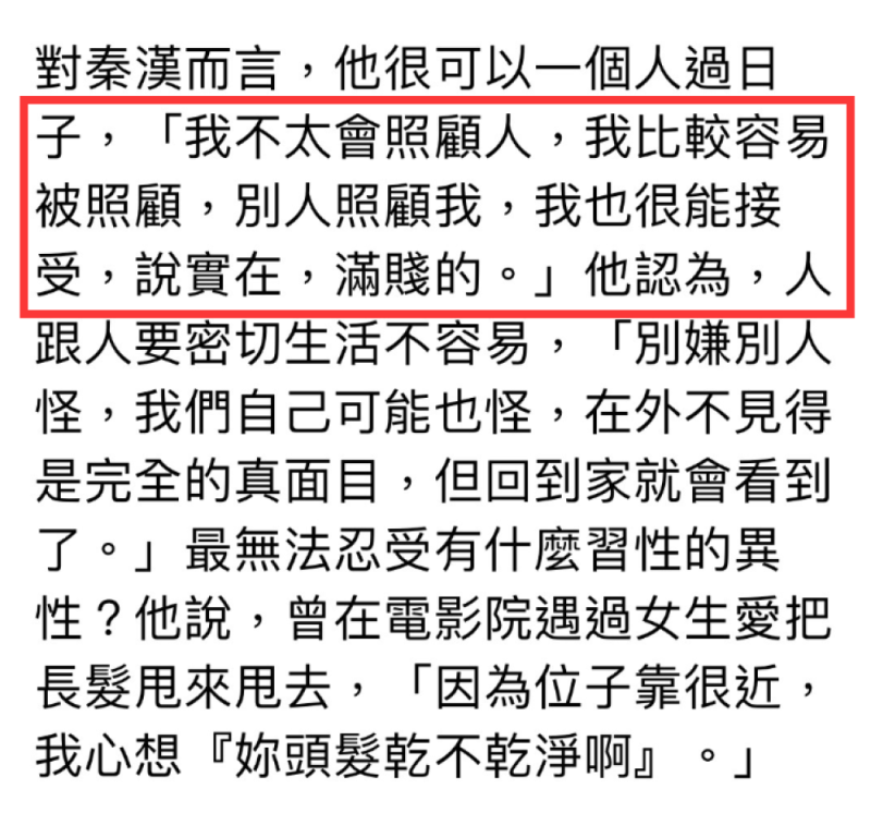 而他本人又喜欢安静,喜欢一个人过日子,也不太会照顾人,比较容易被人照顾,说到这些时,秦汉自认为自己“蛮贱的”,还表示不喜欢异性把长头发甩来甩去,认为对方这样不卫生,从这些采访中可以感受到,秦汉是生活在自我世界的人,很难去接受有人去改变自己的生活。