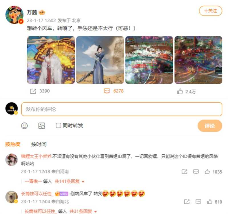 1月17日,万茜发布了一条微博,晒出自己在剑网三游戏中的角色和游戏画面,还自嘲表示想转个风车,结果手法还不太行转成了重伤。很快这条分享就引起了无数魔兽玩家和剑网三玩家的热议,原来女神万茜早在十几年前就和游戏结下了极深的渊源。