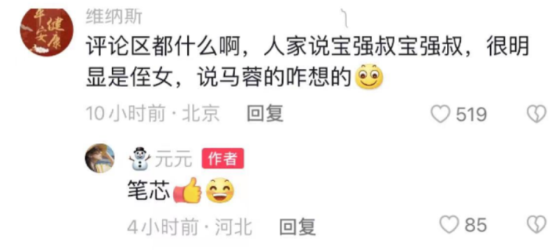 更令人无语的是,有网友评论说“女孩长得像王宝强,男孩像之前马蓉那个经纪人”,侄女却回复说“基因强大吧”,确定看懂网友的留言才回复的吗?