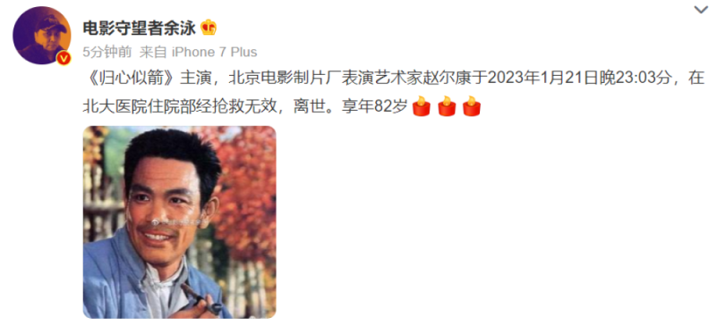 1月23日,据电影守望者余泳透露,北京电影制片厂表演艺术家、国家一级演员赵尔康于21日除夕夜去世,享年82岁。
