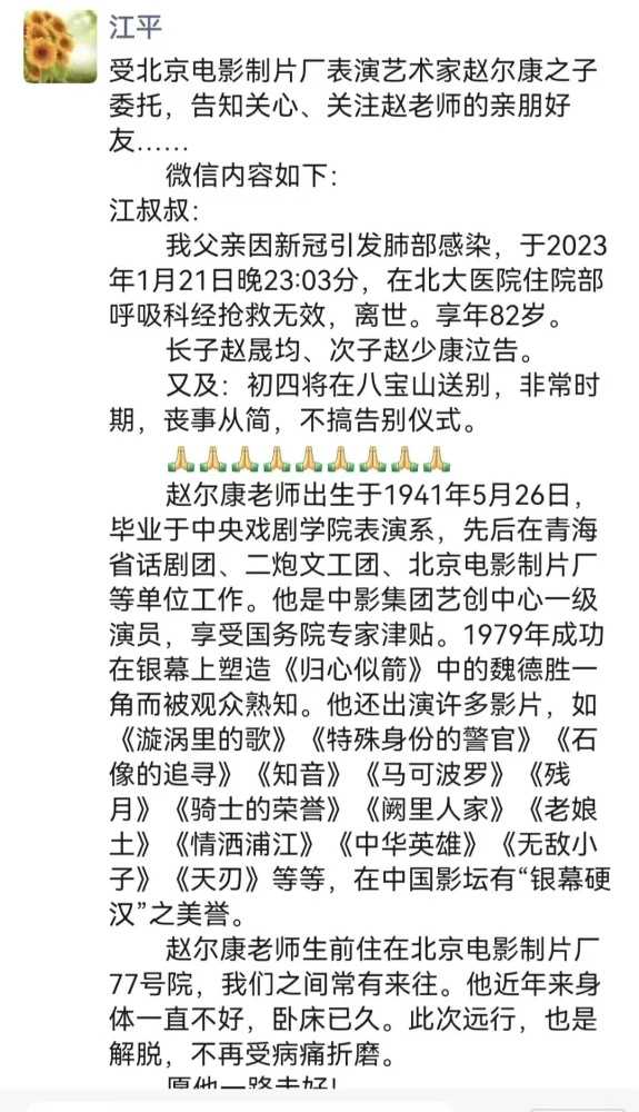著名演员赵尔康去世,儿子悲痛公布后事安排,透露死因是感染新冠