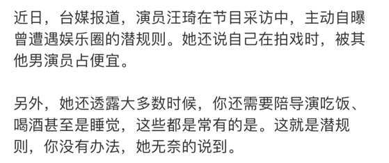 汪琦用亲身经历来展现了娱乐圈现状,不仅在拍戏时会被男演员占便宜,就连陪导演吃饭都有可能还要陪睡,她的这段话非常残酷又很无奈。