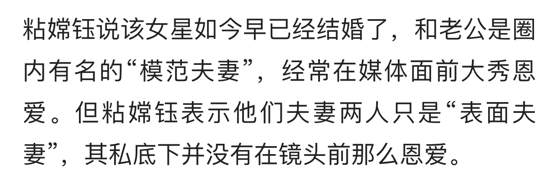除此之外,尽管该女星私生活看起来如此混乱,在圈内口碑也不好,不过她依然拥有一个完整的家庭。粘嫦钰称她已经结婚了,并且对外界她与老公一直维持着"模范夫妻"的头衔,但是两人私下感情并不如台上那么好。