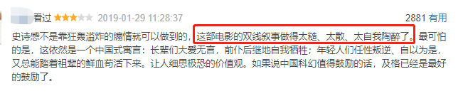 大家对特效夸赞不已,对人物、剧情塑造这块,却集中火力猛攻,人物的扁平化、故事剧情的单薄老套等等都是大问题。