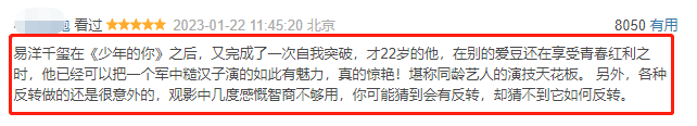当然了,缺点也很明显,至少,就今年来说,虽然易烊千玺和王一博都有进步,但和实力派演员“对打”,差距还是相当明显,这也造成了观众的观影体验有所影响。