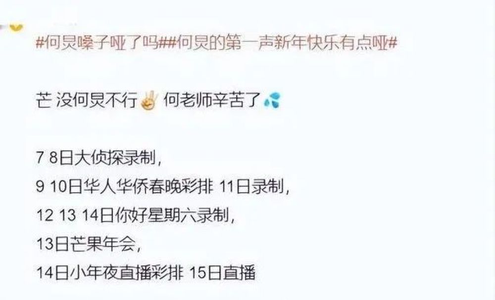 无独有偶,今年的湖南台小年夜春晚,由何炅和汪涵主持。但是,何炅遭遇了巨大的争议,一开口说“新年快乐”,就被大家发现,他的嗓子哑了,并且立刻冲上了热搜。