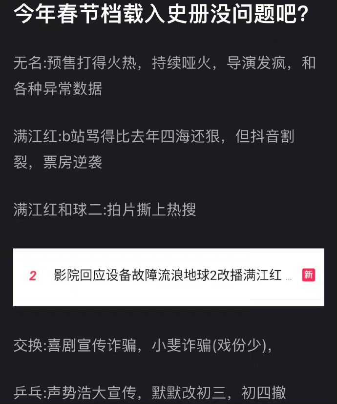 IMAX中国区首席执行官叫孟丹青,而孟丹青的老婆叫张末,张末的父亲叫张艺谋,这样一来,《流浪地球2》排不到IMAX影厅,而《满江红》能够排得到IMAX影厅就可以说得过去了,同时,网友对《满江红》的剧情、主题、价值观的导向说法也是不一的,有网友认为《满江红》是在强行圆逻辑,搞笑的部分也是很尴尬,总而言之就是一个圈钱向的商业类型剧本杀故事,简直和吹出来的高口碑、高质量的标签配不上。