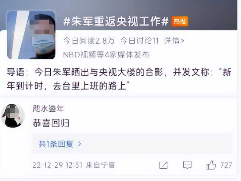 这条新闻一出来,立刻就被顶到了最热门的位置。网民们纷纷向朱军祝贺,祝贺他重返央视。