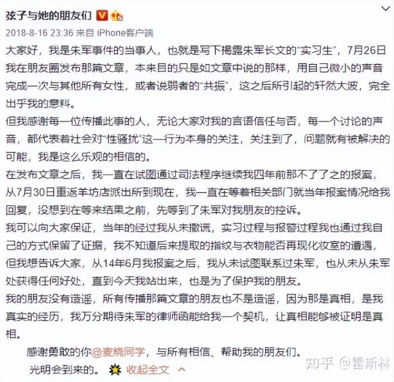 这一次看似随意的现身,却传递出了一条极为隐晦而又重大的讯息:“2020年九月十四号,女子弦子(注:弦子,非女性)控诉朱军性侵一案,经过九个多钟头的审理,此案最终有了结果。