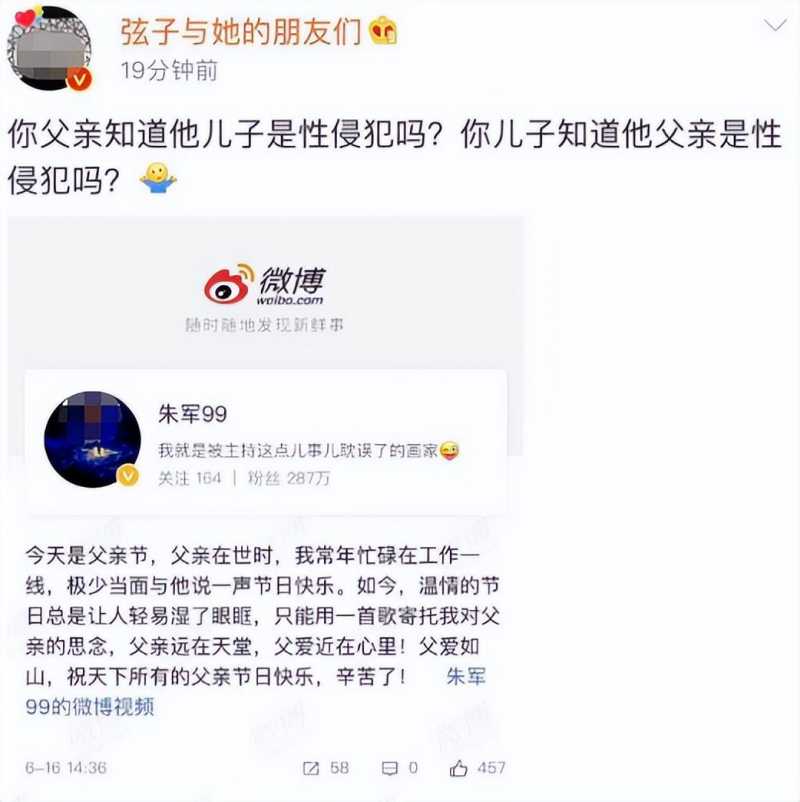 爸爸节,六月十六日。朱军在自己的博客上发了一条消息,表示他很怀念自己的老爸。然而,弦子的微博上,竟然发出了质疑:你爸知不知道自己的孩子被人强奸了?你的孩子是否了解他爸爸的性侵犯?