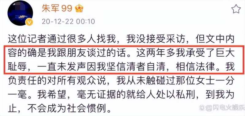 法庭认为,周某某没有充分的证据,故不予采纳,故不予支持。朱军的名声,总算是恢复了。三个多月之后,朱军正式发布了自己的声明,他已经进入了央视。这是不是也在向人们透露,朱先生的职业生涯陷入低迷,很大一部分原因就是因为这个“性侵事件”?