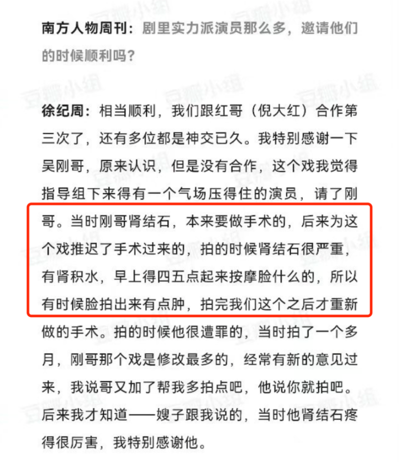 近两年,吴刚一直被说脸肿,导演徐纪周回应,在拍摄过程中,吴刚深受肾结石折磨,脸部严重水肿。但吴刚很敬业,十分配合拍摄,早晨四五点就起床按摩脸。