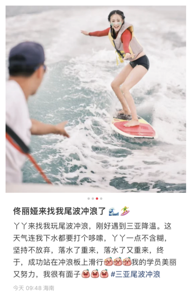分享照片的是佟丽娅的冲浪教练,他说这天气连身为专业人士的他下水都要冻得打哆嗦,但佟丽娅一点不含糊,坚持不放弃,最终成功滑行,教练对佟丽娅的评价很高,夸她不仅长得漂亮还努力,让他觉得很有面子。