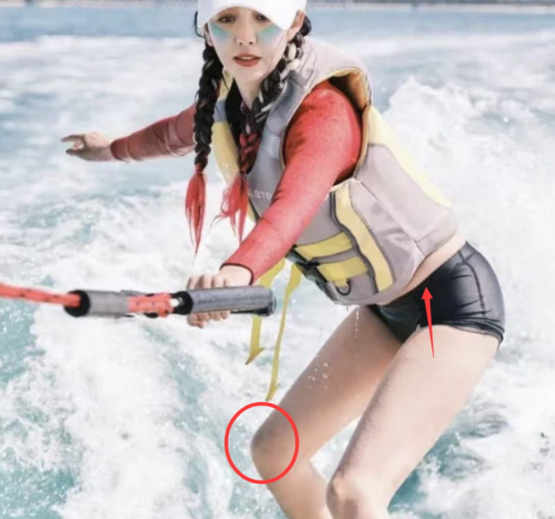 另外,佟丽娅的膝盖看上去有些淤青,脚踝处也有些发红,不知道是不是在学冲浪的过程中受伤了,还是很明显的,其实初学冲浪者是很容易造成磨伤,这个时候还是穿长款的泳衣比较安全,另外脚扭伤也是很常见的,这时也需要身边跟随专业的教练指导,不过看佟丽娅也没什么大问题。