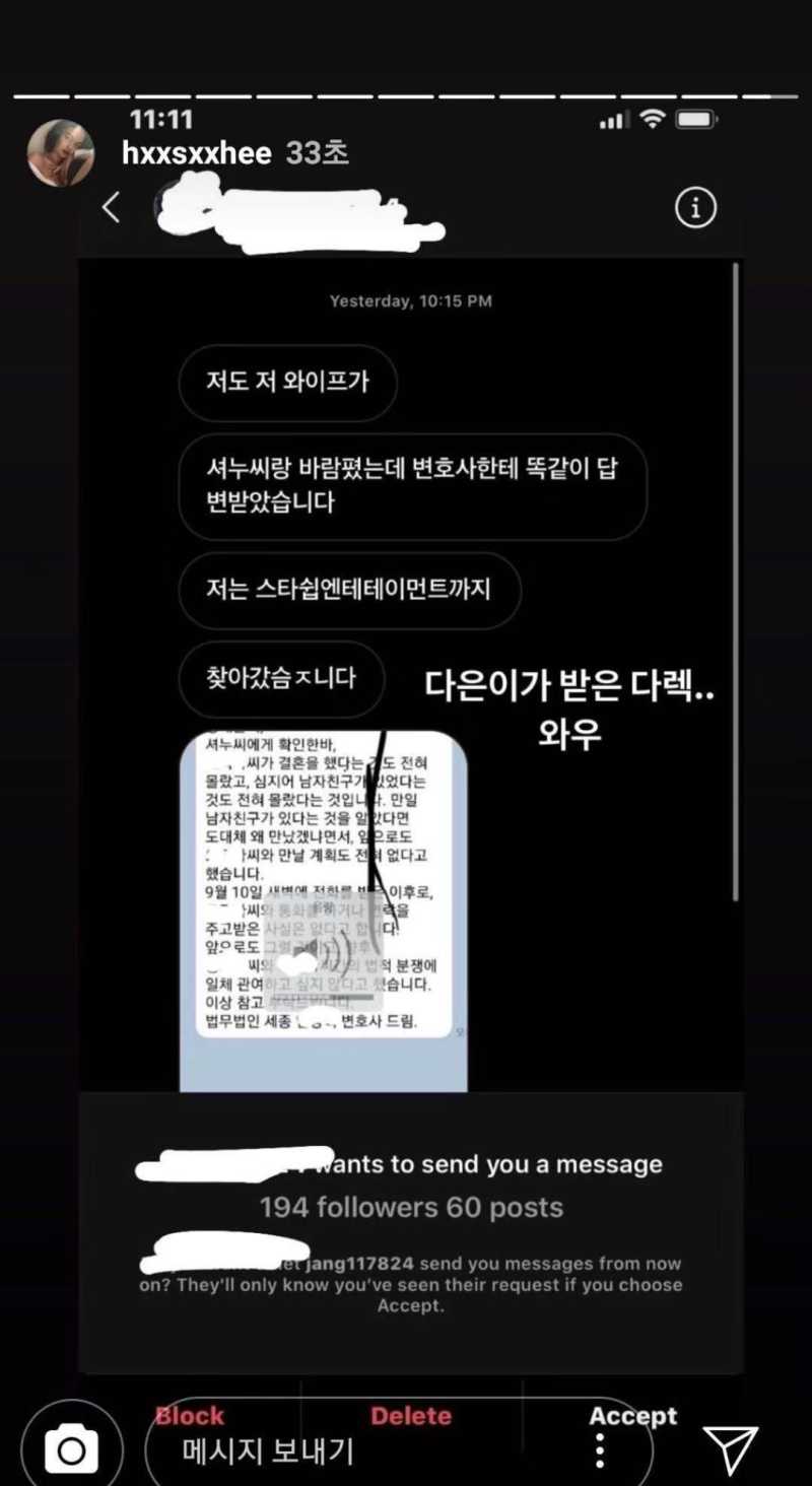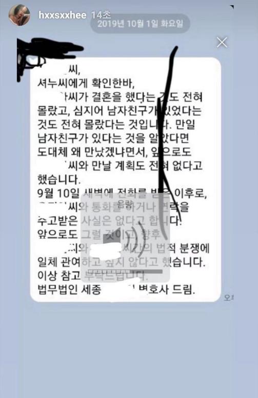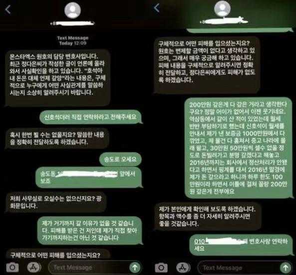 郑多恩的朋友韩瑞希接着在社交平台上放猛料,称有一位男子给郑多恩发过一条私信。私信上说,他的妻子和Monsta X的元虎出轨了,并且收到了Monsta X经纪公司律师的回复。