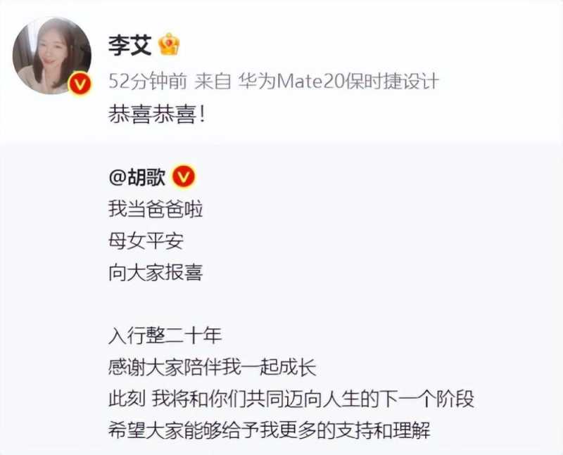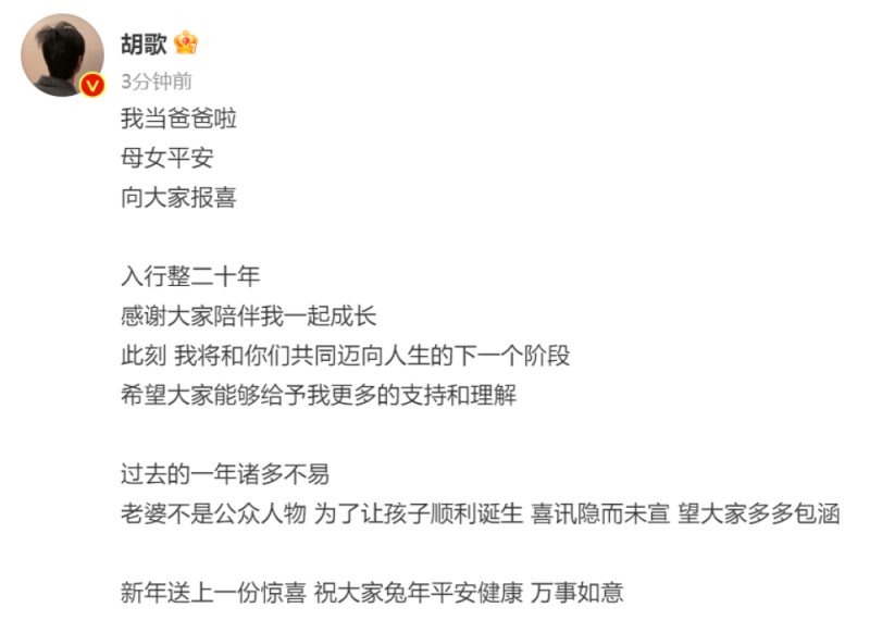 1月31日,演员胡歌猝不及防官宣结婚生女的喜讯,他激动写着“我当爸爸啦,母女平安,向大家报喜,入行整二十年,感谢大家陪伴我一起成长,此刻,我将和你们共同迈向人生的下一个阶段,希望大家能够给予我更多的支持和理解。”