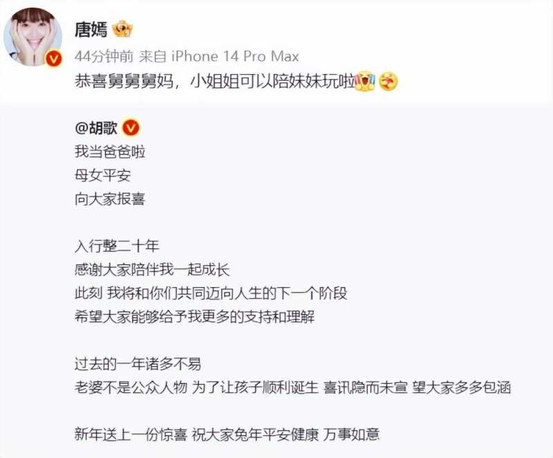 在胡歌公开结婚生女的喜讯后,圈内众多好友发文送祝福,唐嫣袁弘李艾等纷纷恭喜他,唐嫣还直言小姐姐可以陪妹妹玩了,想来以后唐嫣的女儿和胡歌的女儿肯定也是好朋友,将上一辈的友谊延续下去。