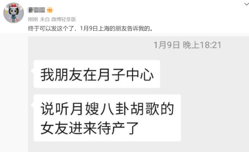 在胡歌官宣当爸的喜讯后,有网友晒出聊天记录表示终于可以发这个了,这位网友爆料胡歌的女友1月9日就已到月子中心待产,想来那个时候该网友不知道胡歌已结婚所以认为是女友。