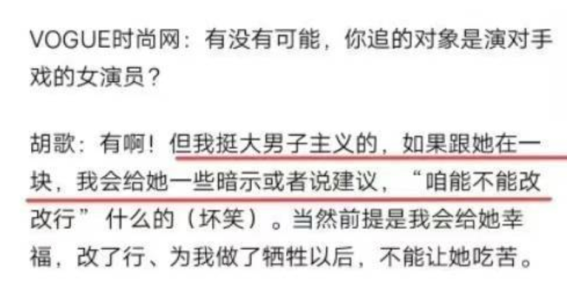 比如,胡歌说自己比较大男子主义,如果和对手戏女演员在一起的话,会希望她改行。