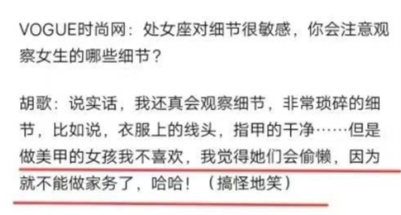 另外,胡歌当时还说,“不喜欢女生美甲,因为做家务很不方便”。