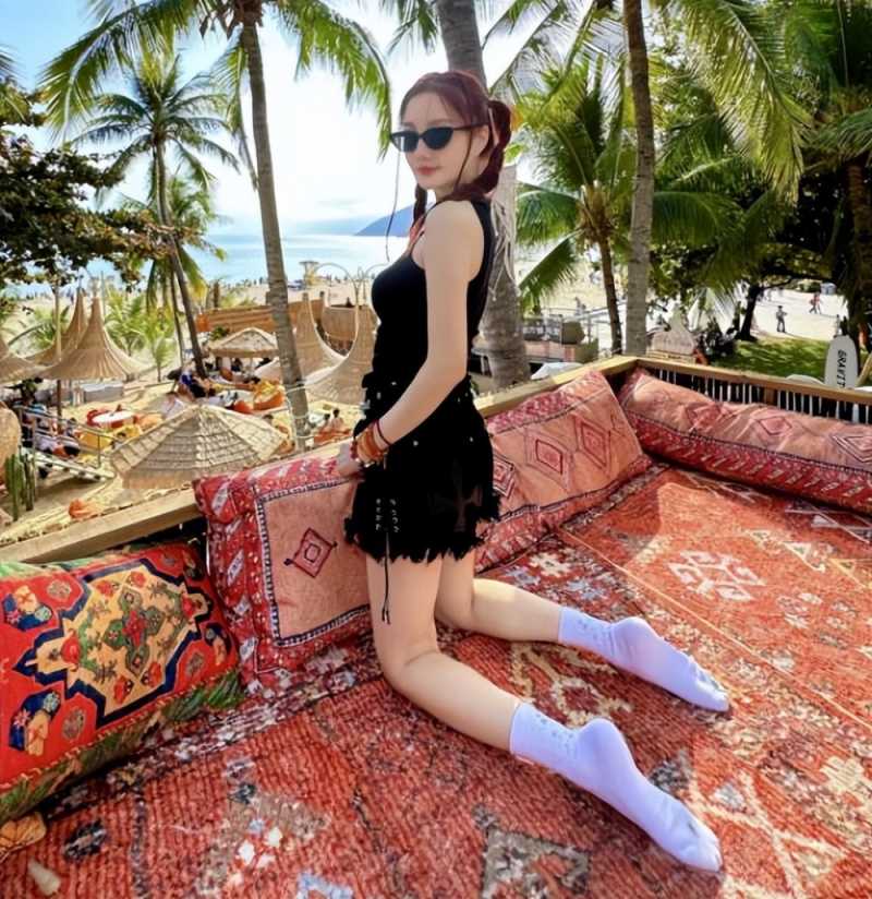 不得不说李小璐的身材保持得非常完美,真的完全不输20多岁的姑娘。穿着袜子的她跪在沙滩旁的休息阁楼上,头发也是打理得非常有个性。
