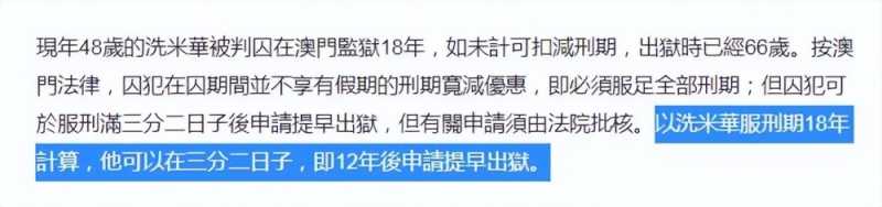 现年已经48岁的洗米华,如果按照18年来推算,他正常出狱的时间会是在66岁。而按照澳门方面的法律,其实囚犯在整个囚期是不享受假期的,这是第一点。