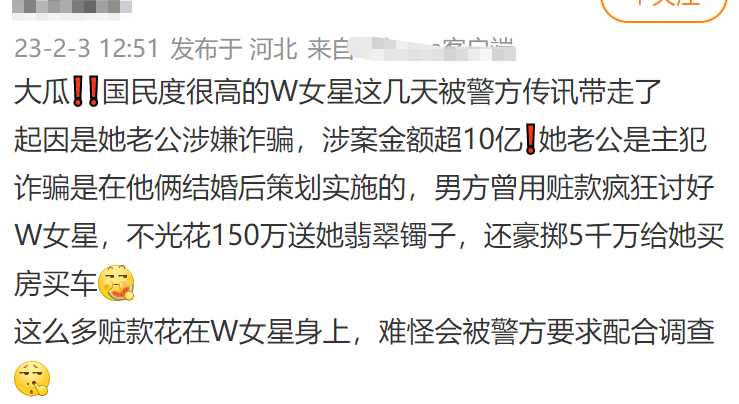 2月3日的中午,八卦媒体突然间曝出了一个大瓜,声称国民度很高的W姓女星,最近几天被传讯带走了。