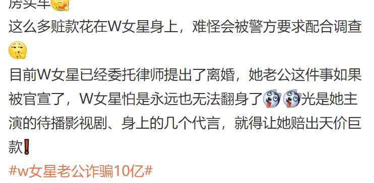 不过,这个事如果是真的,肯定是藏不住的,10个亿是多少人的血汗钱啊,W女星早晚也会被曝光,翻车应该是免不了的了,至于W女星是谁,就只能蹲一个实锤了。
