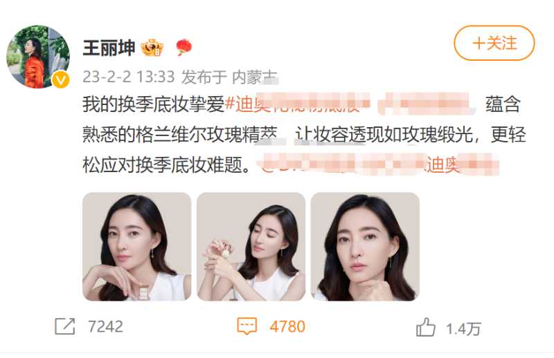 而且,我跑到王丽坤的社交平台账号看了一下,她最近还更新了一条化妆品的内容,应该是自己代言的产品。