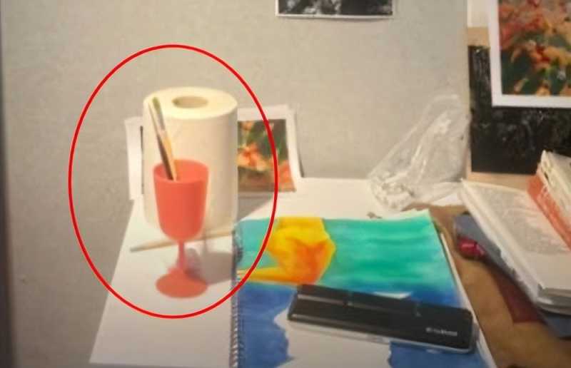 首先是简单的桌上放着一个卷筒纸,然后前面则摆着画笔,李嫣的手机放在绘画作品上面,还有一个塑料袋在桌子上面。