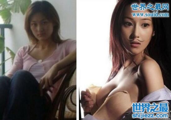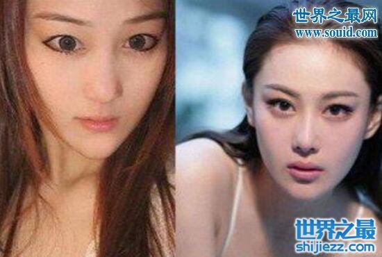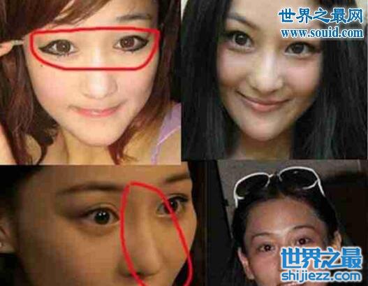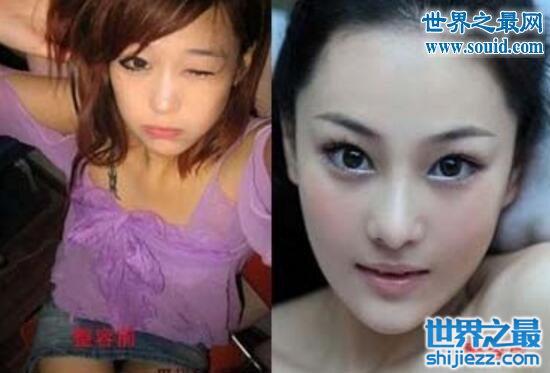 看左右两张图这是同一个人吗?是的,请相信你的眼睛!整容前张馨予小眯眼大鼻子,还有这恶心的眼线是什么鬼,不要吓人好吗?做了割双眼皮隆鼻和缩鼻翼手术后,立马从村姑变女神!