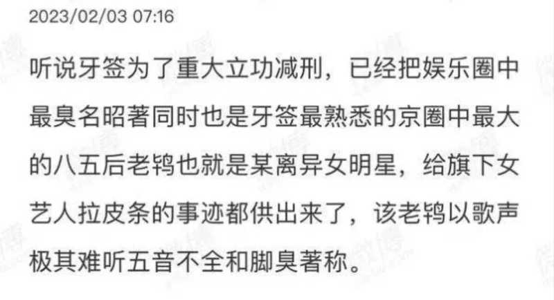 博主的发文中写道了几个关键词:京圈中最大的85女星,离异,五音不全唱歌极其难听,同时还伴有脚臭。