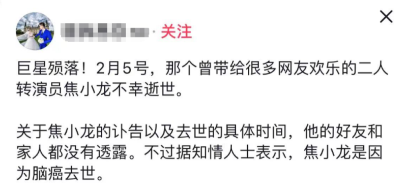 2月5日,娱乐圈再传悲痛噩耗,二人转演员焦小龙不幸逝世,年仅36岁,关于焦小龙的讣告以及去世的细节,家人没有对外透露,不过,有知情人表示,焦小龙是因为脑癌去世。