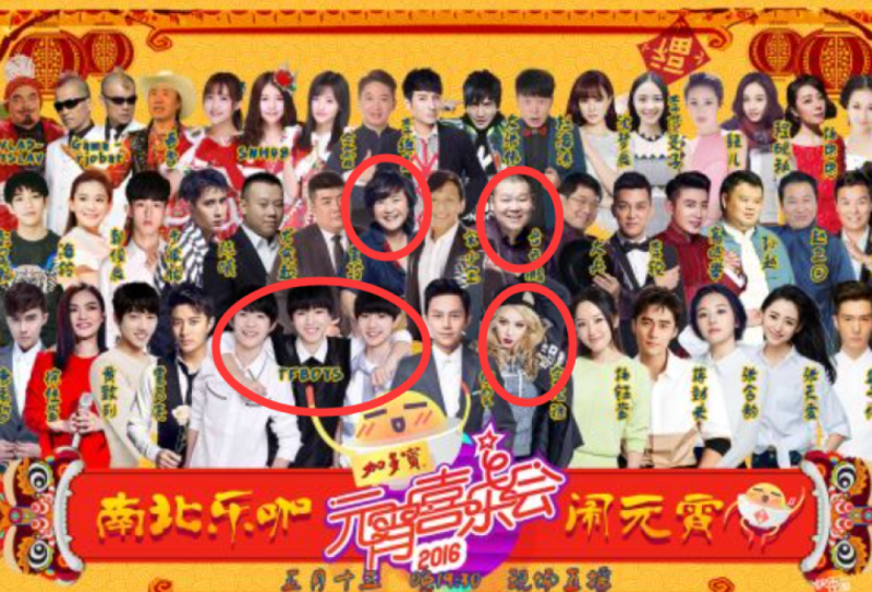 像2016年的元宵晚会,芒果台就请到了TFBOYS、金泫雅、SNH48等顶流明星,以及德云社的热门演员。