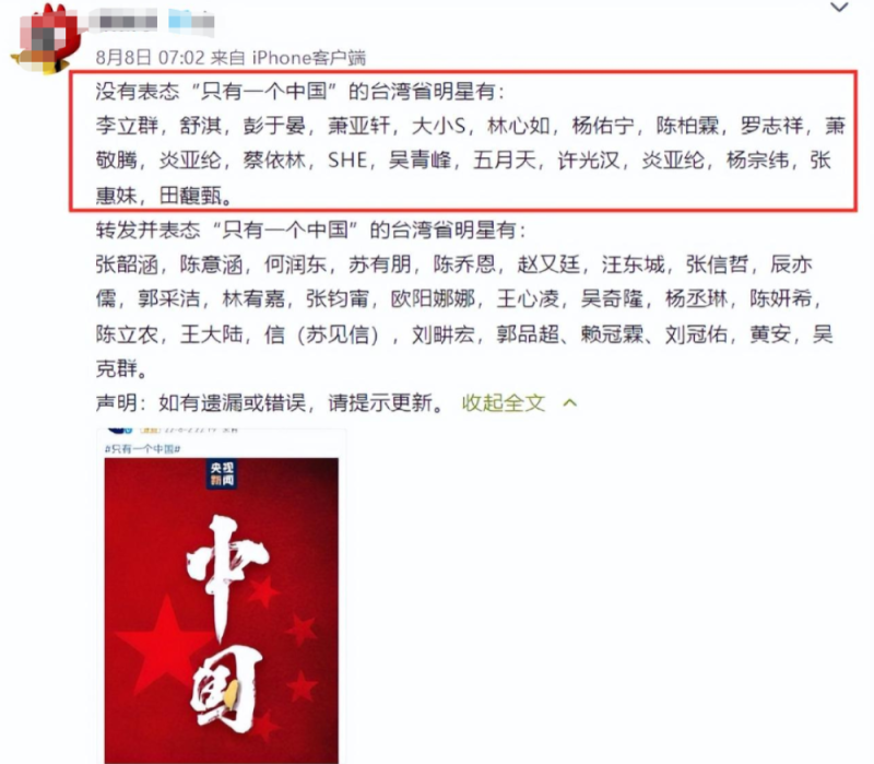 在几乎同时,佩洛西窜访台湾的事情也让不少在内地赚钱的台湾明星露了馅。据统计,当时也有相当一部分台湾艺人没有转发“只有一个中国”的动态,前面提到的林心如也在其中。