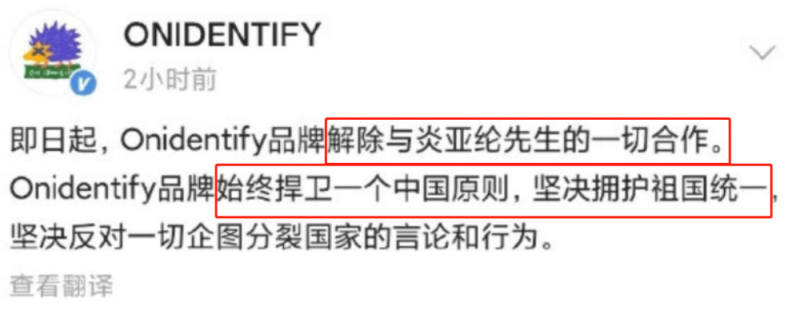 这还没有结束,因为事情影响进一步扩大,很快,炎亚纶的品牌宣布和他“割席”,解除一切合作关系的同时,表明了自己的立场。
