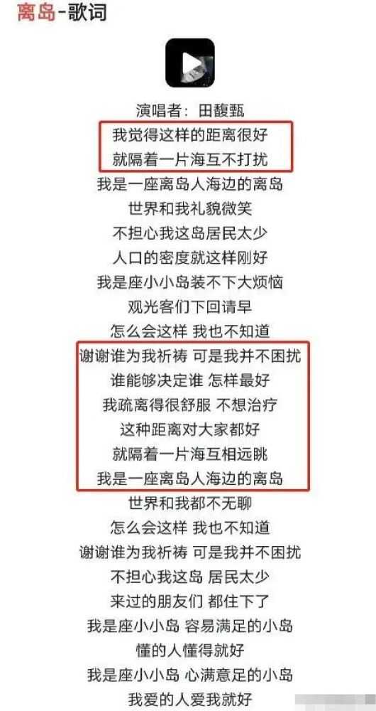 被网友发现后,田馥甄早期的言论也被扒了出来,她几年前的歌《离岛》也被挖出似乎“暗藏深意”。