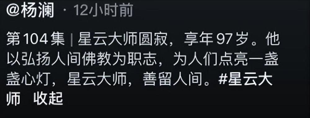 主持人杨澜也特意更新动态追忆星云大师,此前杨澜也曾经亲自采访过星云大师,在两人的对话中也能深切感受到星云大师的胸怀与理想,其中星云大师也曾表示,自己来世还愿意再做和尚,以此来普度诸多众生,以善意点亮更多人的心灯。