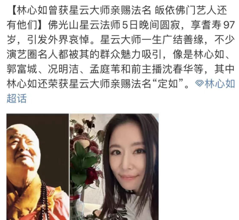 值得一提的是,星云大师生前德高望重,一生广结善缘,很多娱乐圈艺人都对其十分敬仰,而星云大师也与其中不少明星有过接触与交集,其中包括郭富城、孟庭苇、沈春华与林心如,其中林心如还亲自获赠了星云大师赐予的法名“定如”。