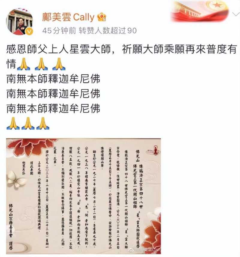 老牌艺人邝美云也发布动态送别星云大师,祈愿大师乘愿再来普度有情,并且亲自为其诵经祈祷。