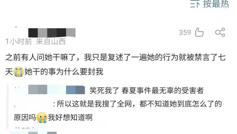 有网友只是把春夏做过的事情在社交账号上复述了一遍,就被禁言7天,所以想要弄清楚春夏因何事塌房,只能等待相关单位的公开说明。
