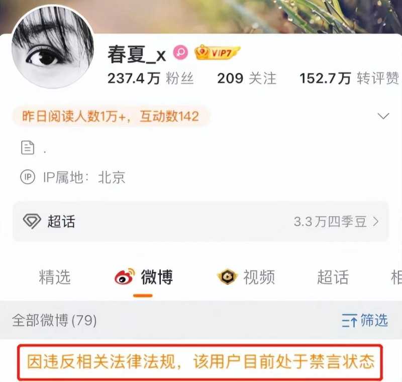 有女演员春夏因为违反法律法规,社交账号被禁言;