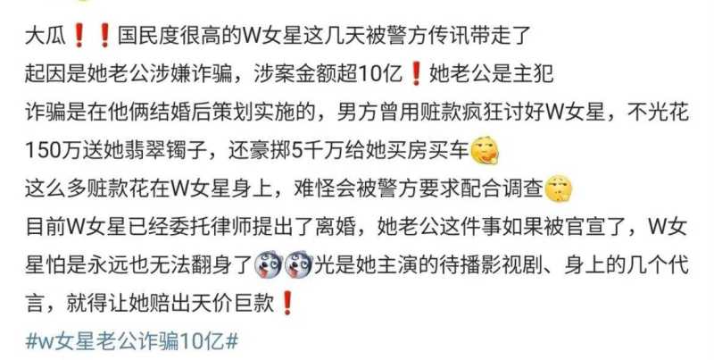 有W女星被爆被传唤带走,其老公诈骗超过10亿。