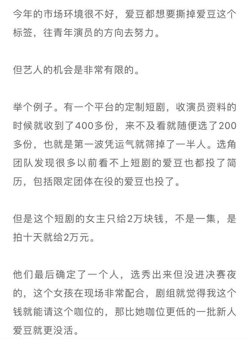 “王大发”透露,她知道一位资深选秀爱豆,已经到了再不演男一号,可能以后就没有演出机会的地步,对方为此以1.5万元的薪酬,争取到了某部剧的男主角。