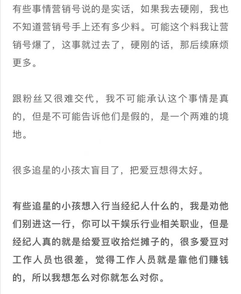 尤其很多追星的小孩子太信任偶像,总觉得营销号爆出来的负面新闻是假料,但事实上,这些料都是大实话,经纪人不能硬刚,害怕激怒对方,放出更多对艺人不利的黑料。