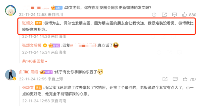 比如张颂文,网友发现他的微博像写日记,经常会跟网友互动,而他的回复一点都不像明星,更像是身边的一位老朋友。