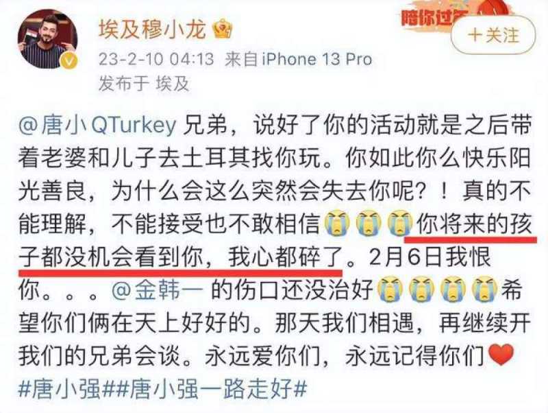 唐小强离世之后,《非正式会谈》的埃及代表穆小龙也口吻哀伤地发文悼念,从其晒出的两人对话信息可以得知,唐小强此次回到土耳其是要参加导游考试,两周后返回伊斯坦布尔,在聊天中,唐小强还盛情邀请好兄弟穆小龙带着家人来土耳其做客。穆小龙也证实了唐小强的妻子怀了二胎,可以想象,肚中的孩子都没能见到爸爸一面,是多么地难过。