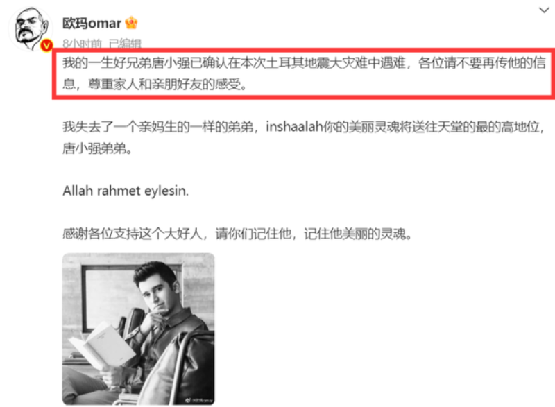为了尊重逝者,也希望外界不要再转发相关新闻,据悉,最初发布唐小强去世噩耗的也是欧玛,从唐小强在震后下落不明之后,欧玛便竭尽所能地四处求助,期盼能看到奇迹的发生。